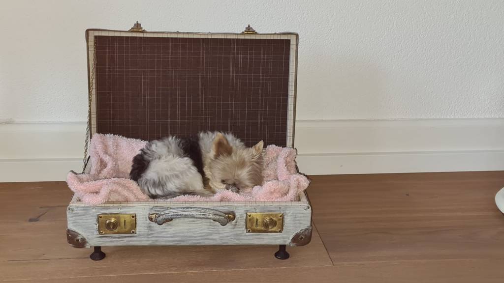Ein alter Koffer, vom Reisen müde, vom Leben gezeichnet. Mit Schaumstoff weich gepolstert – für königlichen Komfort. Ausgeschlagen mit wasserfestem Tuch, für alle Fälle, falls der Hund mal… na ja, du weißt schon. Er thront auf Beinchen aus alten Fadenspulen, die einst Garn trugen und nun Gemütlichkeit tragen.