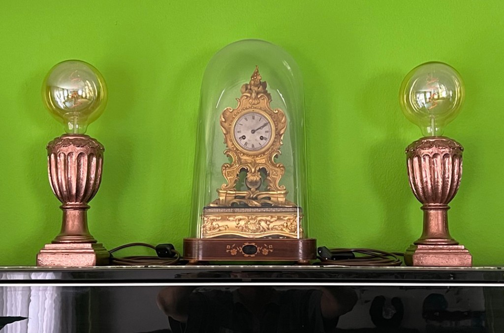 Das Holz wurde in einem warmen, metallisch schimmernden Bronze-Ton gefasst. So treffen hier alt und neu aufeinander – ohne sich zu stören. Die Lampen stehen heute zu zweit, flankierend, wie ein stilles Wachpaar an der Seite einer alten Tischuhr. Auch diese unter Glas, auch sie ein Stück aus einer anderen Zeit.