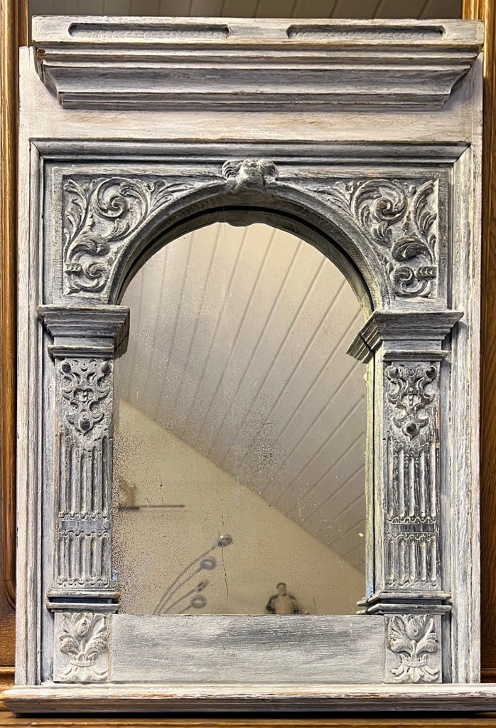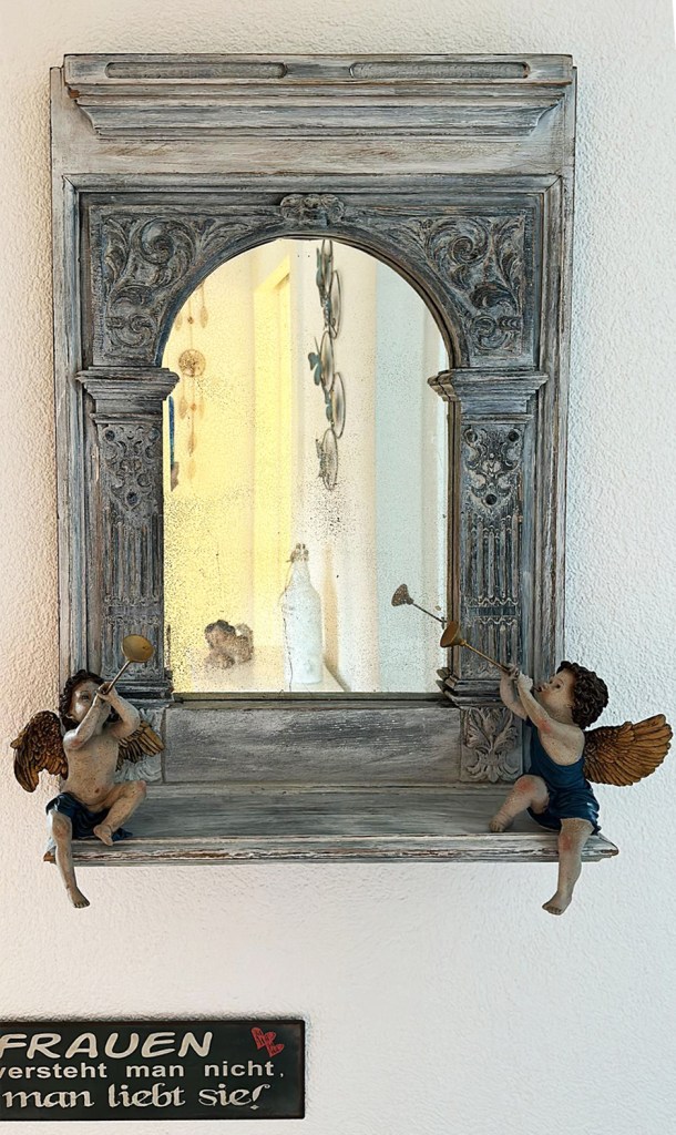 Heute hängt der Spiegel im Entrée seiner neuen Besitzerin. Zwei kleine Engel, von ihr liebevoll platziert, wachen über die sich spiegelnden. Und irgendwo im Hintergrund, fast unsichtbar, lebt ein Teil des alte Buffets weiter – einfach in einer anderen Form. (Und ja, das Schildchen unten auf dem Foto habe ich ihr zuliebe drauf gelassen).