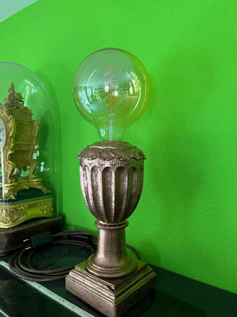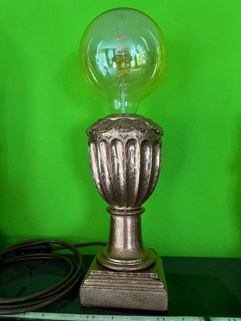 Zwei davon wurden zu Lampenfüssen. Keine moderne LED-Pfunzeln, sondern richtige Sockel mit Charakter. Die Form blieb, der Zweck wandelte sich. Obendrauf: grosse, warme Leuchtkugeln mit sichtbarem Glühdraht – wie kleine Sonnen auf Podesten.