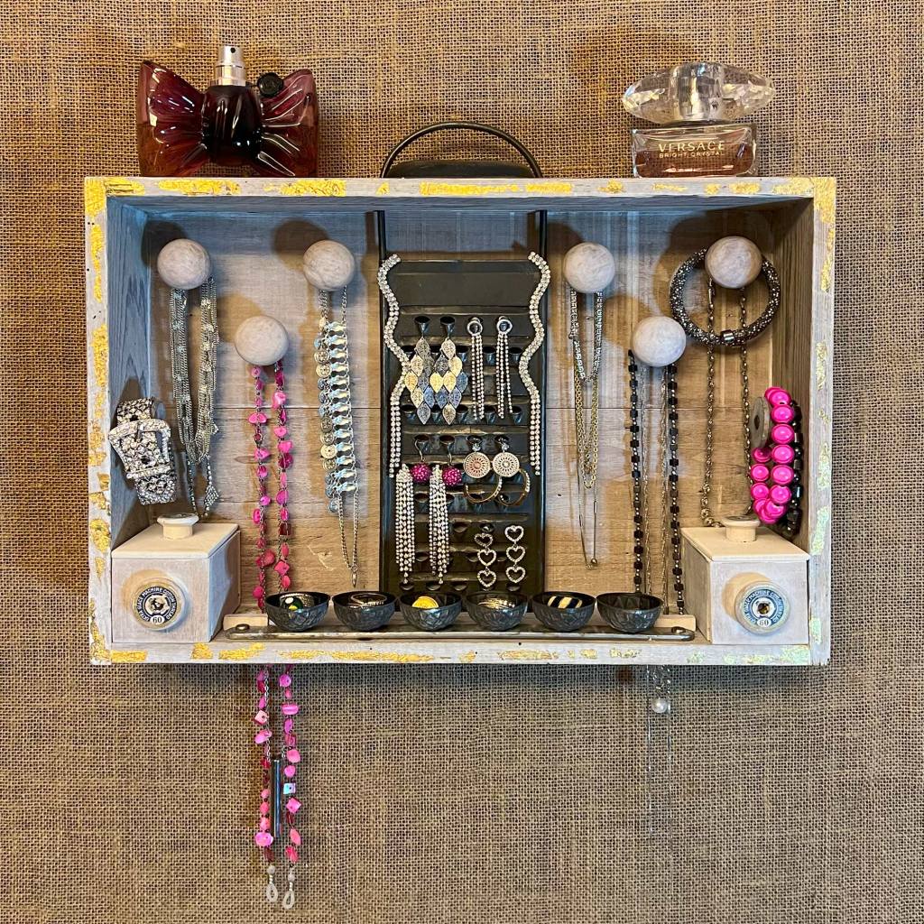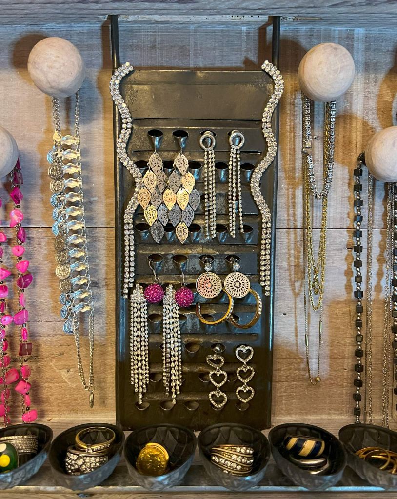 Ketten und Armbänder warten auf ihren nächsten Einsatz – an alten Schubladengriffen, die nun eine neue Rolle übernehmen. Zwei Löcher im Boden schaffen Raum für längere Ketten.