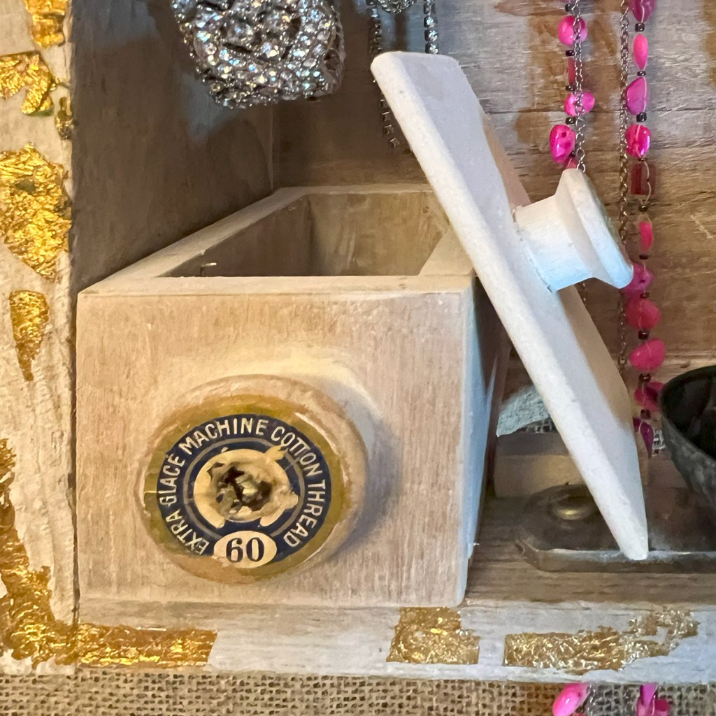 Der Kleinkram findet Platz in zwei kleinen Holzkistchen. Zum Herausziehen dienen halbe Fadenspulen – nicht nur praktisch, sondern auch schön. Dazwischen die alte Form eines Confiseurs: einst zum Giessen von Schokoladeneiern, heute als Ringfach im Einsatz.